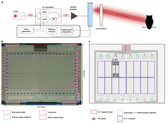 a,成像芯片同时充当发射器和接收器的系统架构;b,芯片显微图像,显示有源光学区域;c,成像芯片上的光路选择过程示意图。(图片来源:Nature论文)