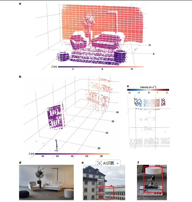 a,使用35mm焦距透镜单次采集的办公室场景(6-11米)点云;b,使用50mm焦距透镜对20-65米外的两栋建筑进行四次采集相干平均获得的点云;c,绕垂直轴旋转圆盘的带速度注释点云;d-f,对应场景的照片。(图片来源:Nature论文)*