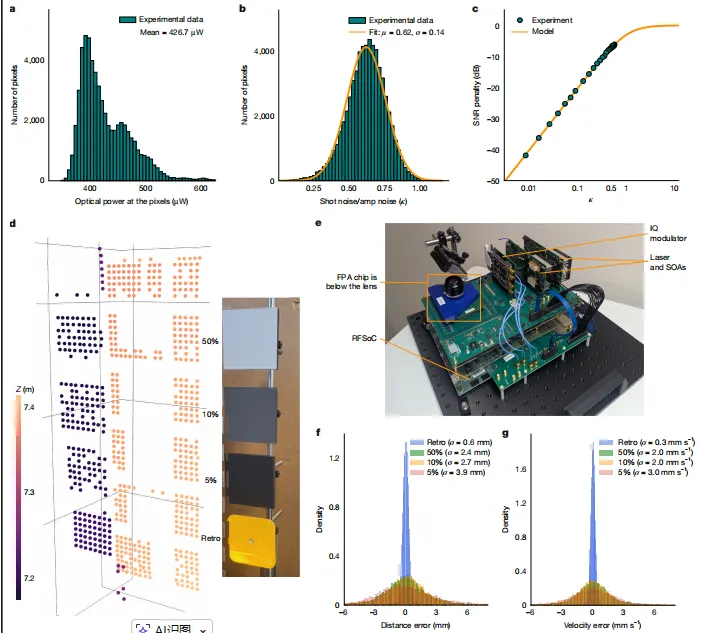 a,每个像素接收光功率分布;b,测量得到的散粒噪声与放大器噪声比值κ分布;c,SNR损失与散粒噪声-放大器噪声比的关系;f,g,距离(f)和速度(g)测量误差分布。(图片来源:Nature论文)