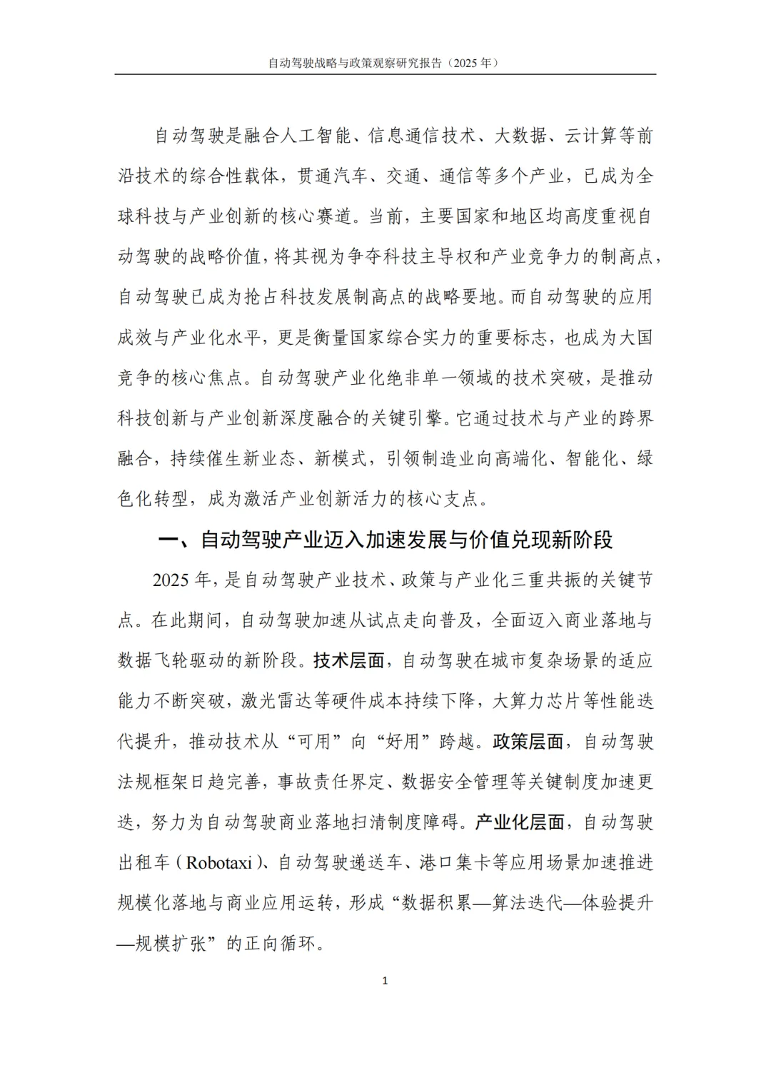 报告以产业现状 - 政策体系 - 发展展望 - 落地建议为核心框架,形成完整的分析与指导体系:先明确自动驾驶产业已进入加速发展与价值兑现新阶段,解析三大核心场景落地进展;