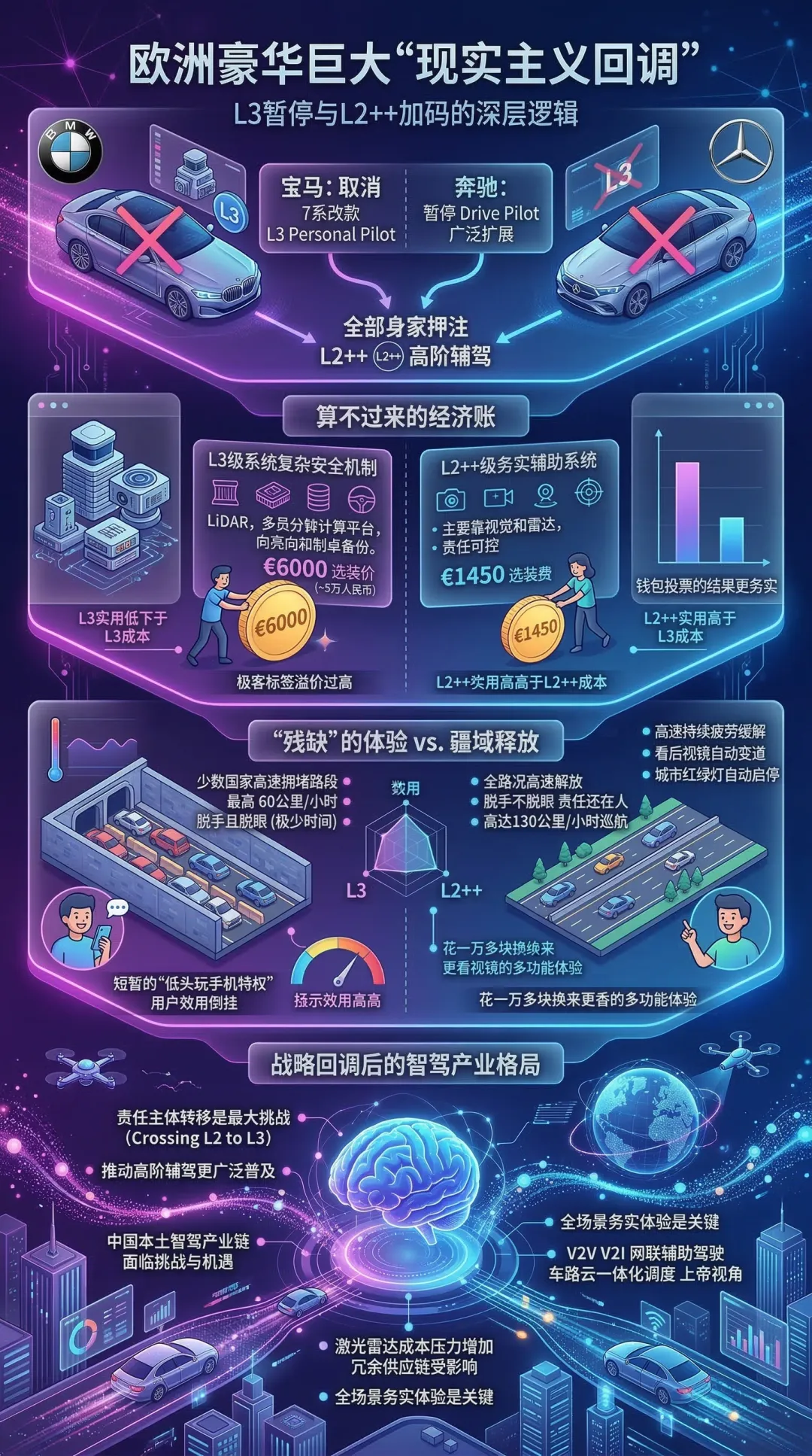 在这个全行业都在为高阶智驾突飞猛进的态势下,百年德国巨头集体上演“大撤退”,绝对不是简单的技术溃败。这背后,是传统车企在经历技术狂热后,被现实的成本、法规和用户体验狠狠敲打后做出的冷酷“现实主义”回调。他们为什么放弃L3,以及对咱们中国本土智驾产业链究竟意味着什么。