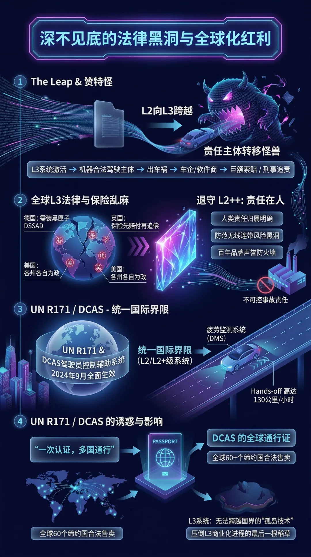 外部法规的东风也起到了决定性作用。联合国出台的第171号法规(UN R171,关于DCAS驾驶员控制辅助系统)在2024年9月全面生效,第一次为L2/L2+级系统划定了统一的国际界限。它允许高达130公里/小时的脱手驾驶,前提是必须靠疲劳监测系统(DMS)死死盯住驾驶员的眼睛。这套法规最大的诱惑在于“一次认证,多国通行”,宝马的新系统只要过审,就能在全球60个缔约国合法售卖。L3系统至今仍是无法跨越国界的“孤岛技术”,DCAS的全球通行证直接成为了压倒L3商业化进程的最后一根稻草。