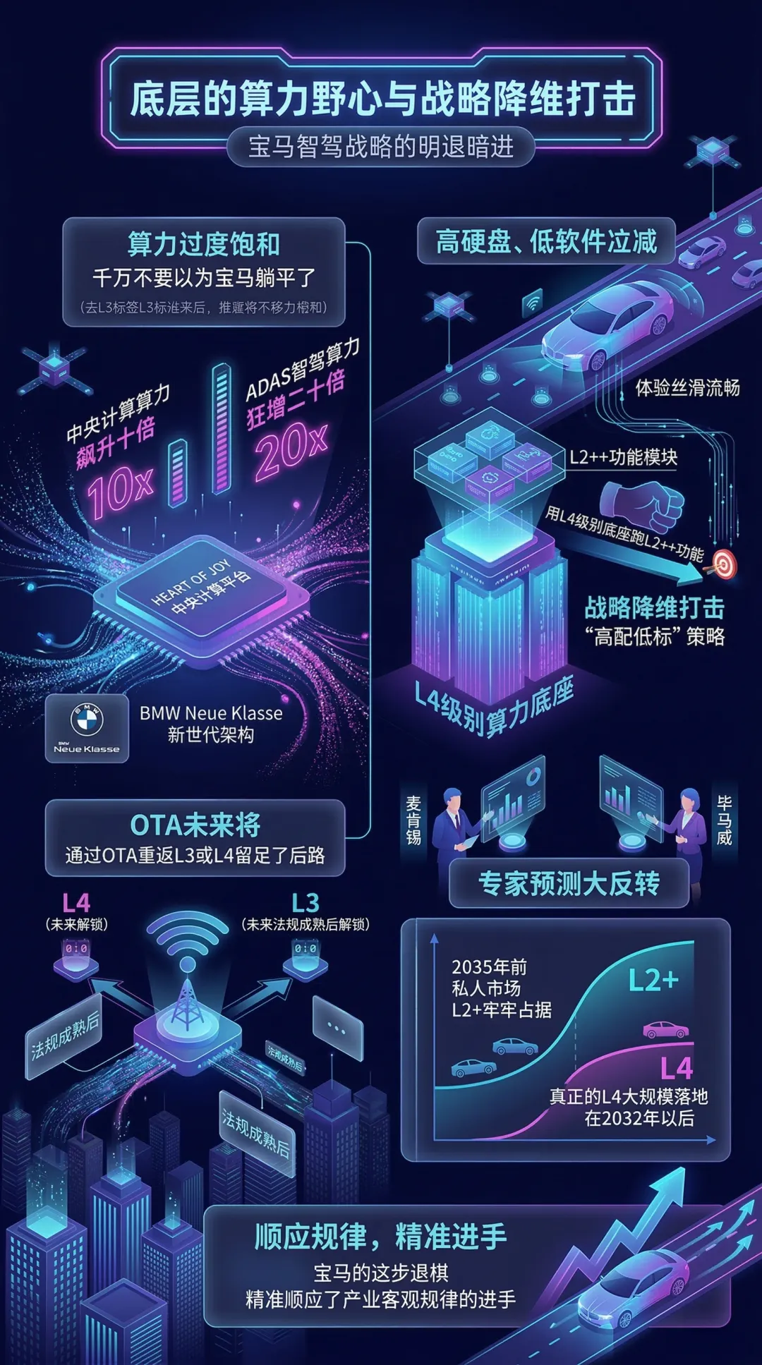 这种算力上的过度饱和,暴露了宝马“高配低标”的降维打击策略:用L4级别的算力底座去跑L2++功能,保证体验丝滑流畅,同时给未来法规成熟后通过OTA重返L3或L4留足了后路。麦肯锡和毕马威等机构的专家预测也出现了重大反转,大家普遍认为到2035年前,私人市场都将被L2+牢牢占据,真正的L4大规模落地得等到2032年以后。宝马的这步退棋,其实精准顺应了产业客观规律的进手。