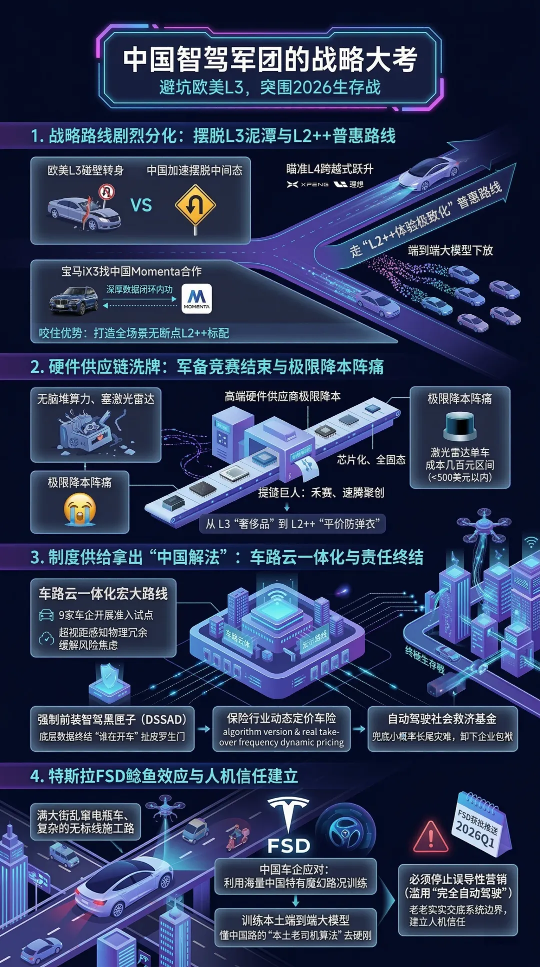 首先是战略路线的剧烈分化。中国头部企业正在加速摆脱L3这个高成本、低体验的“中间态泥潭”。小鹏、理想等新势力直接把目光瞄准了L4的跨越式跃升,同时利用端到端大模型技术,把原本高高在上的高阶智驾功能迅速下放,走一条“L2++体验极致化”的普惠路线。非常有意思的是,宝马给中国市场定制的iX3,转头就找了中国本土的初创企业Momenta合作,看中的正是他们在端到端数据闭环上的深厚内功。咱们中国车企必须咬住这个优势,把全场景无断点的L2++打造成智能汽车的标配。