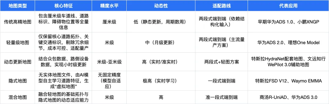 5. 适配性极强:既是两段式端到端量产方案的标配(如华为ADS 2.0、理想One Model),可为感知层提供结构化输入;也能辅助一段式端到端方案,在弱感知场景中修正定位,实现“轻图+隐式地图”混合模式;同时可升级为动态轻地图或融合隐式地图,衔接地图向“无图化”演进的趋势。