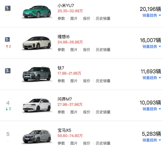 小米YU7是小米汽车旗下第二款车型,也是首款SUV,于2025年6月上市,目前售价为25.35-32.99万元。作为一款上市不到一年的全新车型,小米YU7以20196辆的月销量排名中大型SUV销量榜榜首,这样的市场表现还是相当成功的,这也从某种层面上说明了消费者对该车的认可。截至2月底,小米YU7累计销量为58065辆。