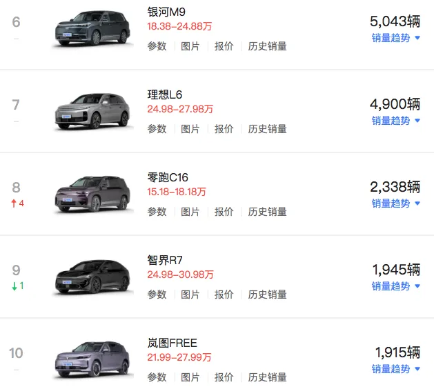 2月宝马X5以5283辆的销量排名榜单第五名,1至2月累计销量为13135辆。银河M9、理想L6、零跑C16、智界R7、岚图FREE销量分别为5043辆、4900辆、2338辆、1945辆、1915辆,1至2月累计销量为11635辆、9925辆、4748辆、5766辆、5480辆。其中,银河M9在银河品牌中定位旗舰车型,于2025年9月上市,目前售价为18.38-24.88万元,动力上搭载1.5T四缸涡轮增压发动机+3电动机组成的插电式混动系统,在车市中与长安深蓝S09、乐道L90、昊铂HL等车型竞争。