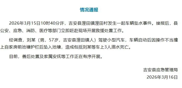 3月16日,江西吉安县应急管理局发布情况通报:2026年3月15日10时40分许,吉安县浬田镇浬田村发生一起车辆坠水事件。接报后,县公安、应急、消防、医疗等部门立即赶赴现场开展救援处置工作。经调查,刘某(男,57岁,吉安县浬田镇人)驾驶小型汽车,车辆启动后因操作不当撞上自家房前池塘护栏后坠入池塘,造成包括刘某等车上3人溺水死亡。目前,善后处置及家属安抚等工作正在有序开展。