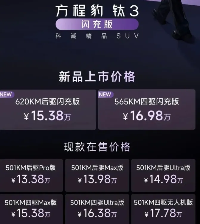 再说另一边的方程豹钛3闪充版,这次也悄悄上了新。两个版本:后驱620公里续航卖15.38万,四驱565公里续航卖16.98万。哎,发现没有?16.98万这个数字,正好能买到iCAR V27的入门版,也能买到钛3的顶配四驱版。一个是增程大块头,一个是纯电闪充小钢炮,如果是你,你怎么选?