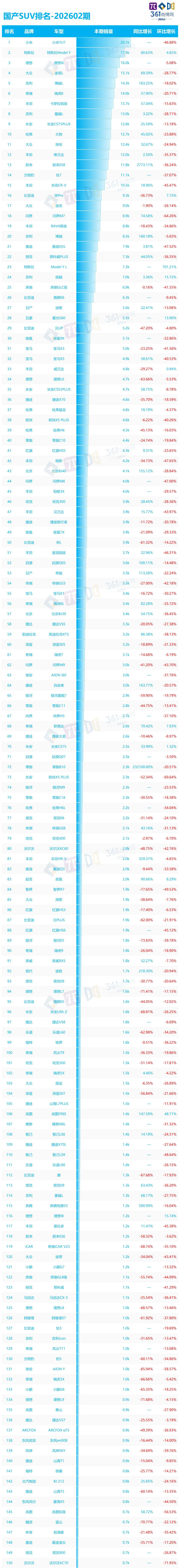 2026 年 2 月国产 SUV 市场呈现新势力领跑、合资与自主分化加剧的格局。