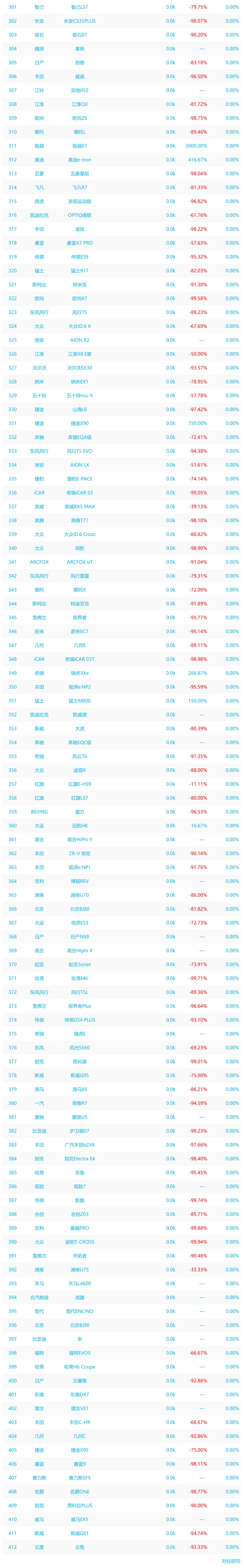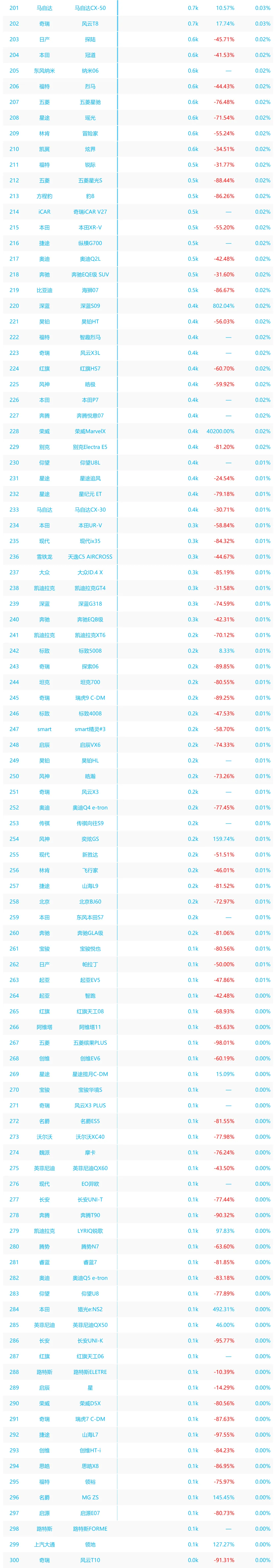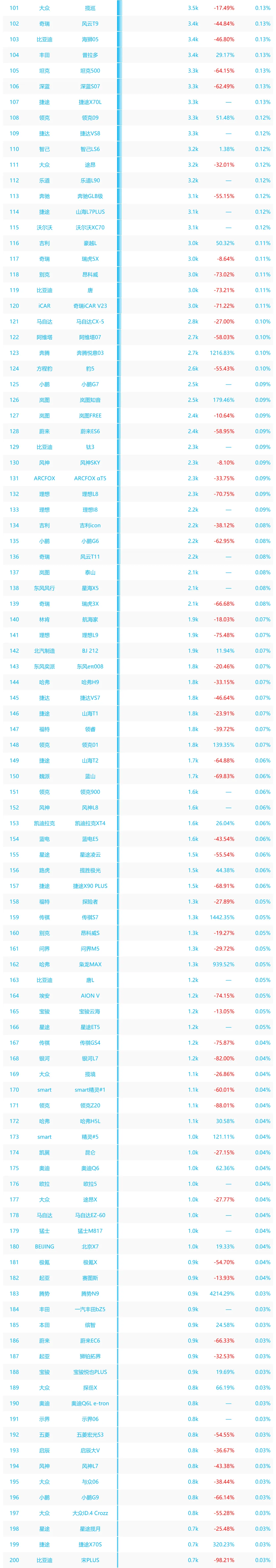 从销量来看,小米 YU7 以 20.1k 辆位居榜首,特斯拉 Model Y(17.9k 辆)、理想 i6(16.0k 辆)紧随其后,大众途观 L、吉利博越 L 等车型也进入前五,构成核心销量梯队;榜单后半段多款车型销量仅 0.3k 辆及以下,尾部车型表现低迷。