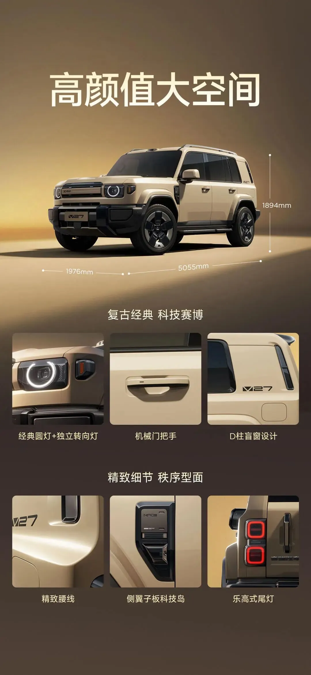 作为iCAR品牌首款增程车型,iCAR V27延续了品牌经典的“方盒子”造型,车身尺寸长宽高为5055mm×1976mm×1935mm(含外挂备胎),轴距2910mm,车长超越丰田普拉多,定位中大型家庭硬派SUV。
