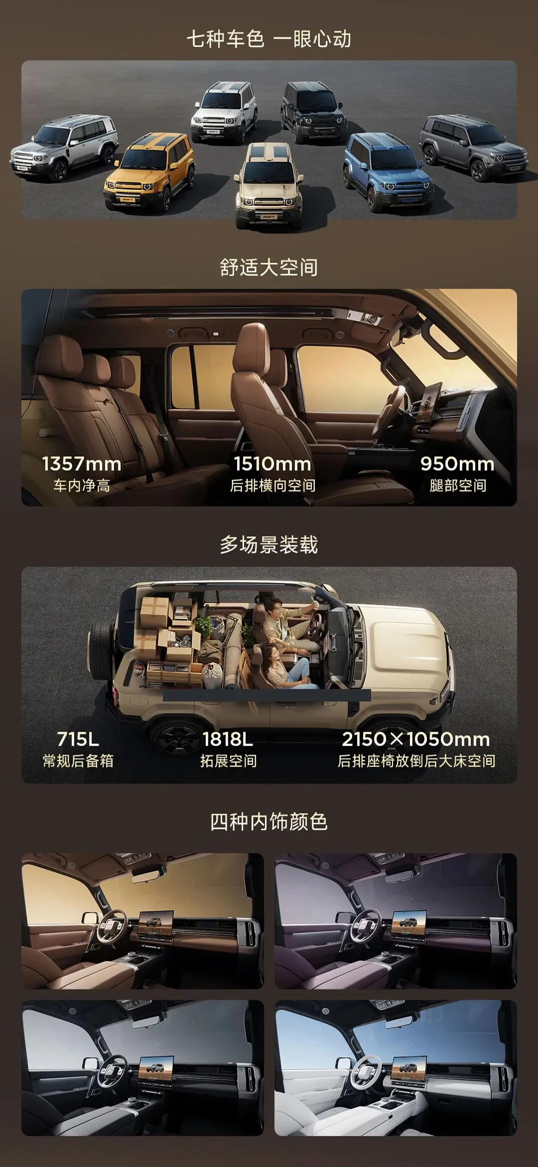 常规后备箱容积715L,放倒后排座椅后形成近乎纯平空间,容积扩展至1818L,配合定制床垫秒变2150mm×1050mm双人床,全车多达50处储物空间。