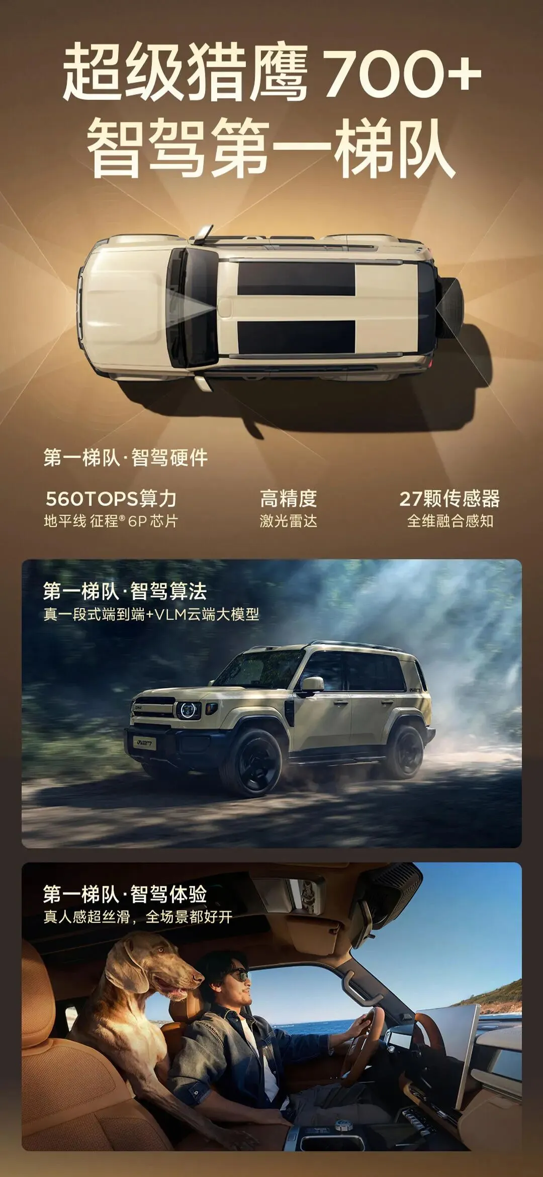 顶配的猎鹰700版搭载征程6P芯片,560TOPS算力,配合1颗激光雷达+27颗高精度传感器,可实现不依赖高精地图的全场景城市/高速领航NOA。