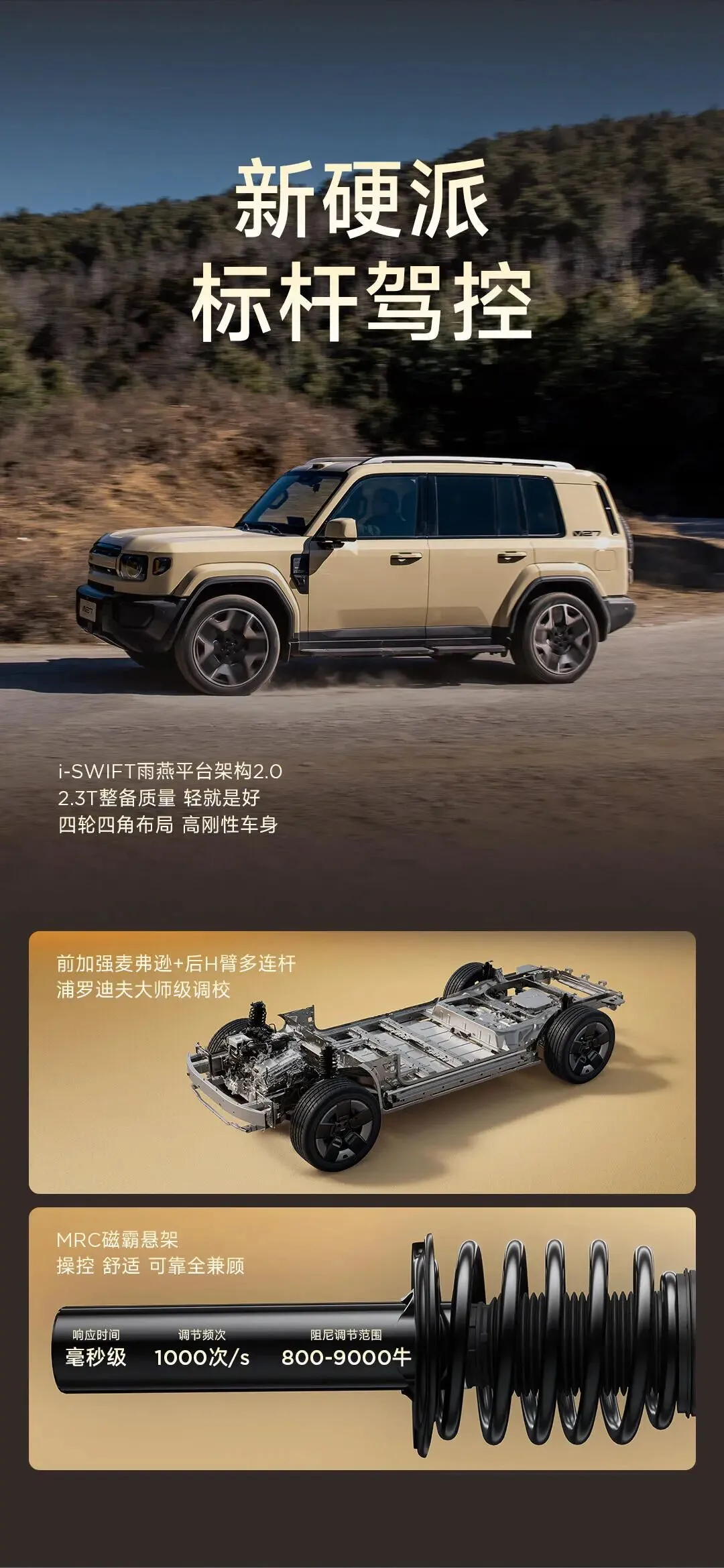 首次搭载地平线HSD全场景辅助驾驶系统,并以MRC磁流变悬架、8295P芯片、宁德时代电池等越级配置,直接对标当前热销的方程豹钛7。