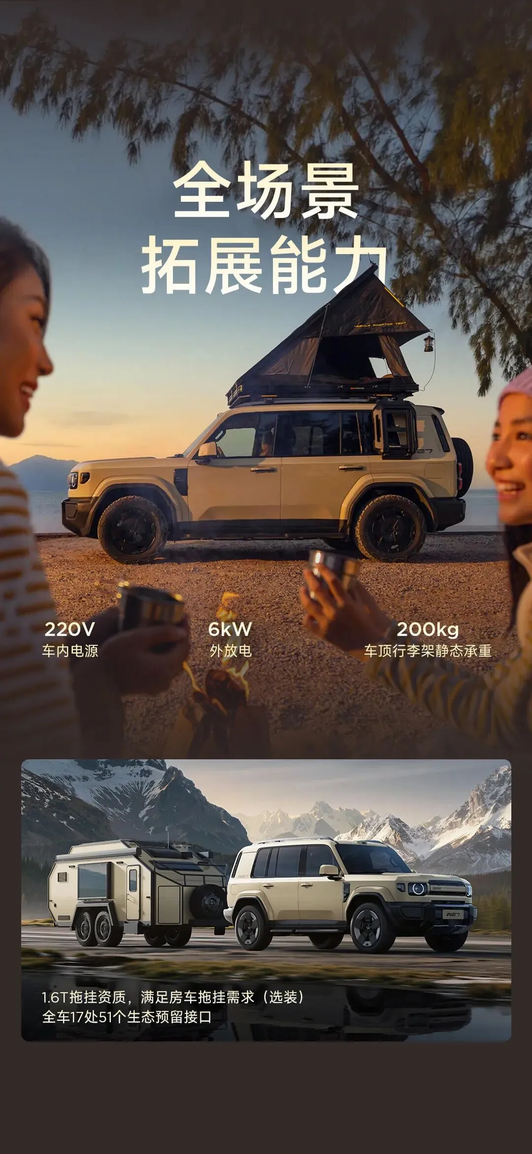 想有个性化的改装?方便的很!全车配备17处51个生态接口,四驱版限时赠送拖车套装:1.6吨拖挂资质+拖车钩+拖车电源取电口,满足户外探索的各类拓展需求。