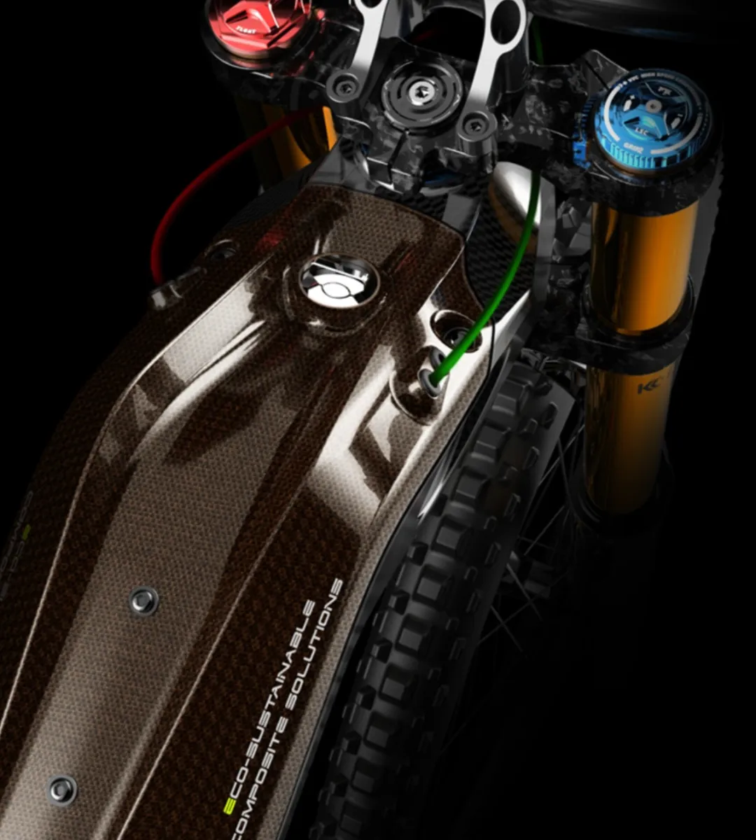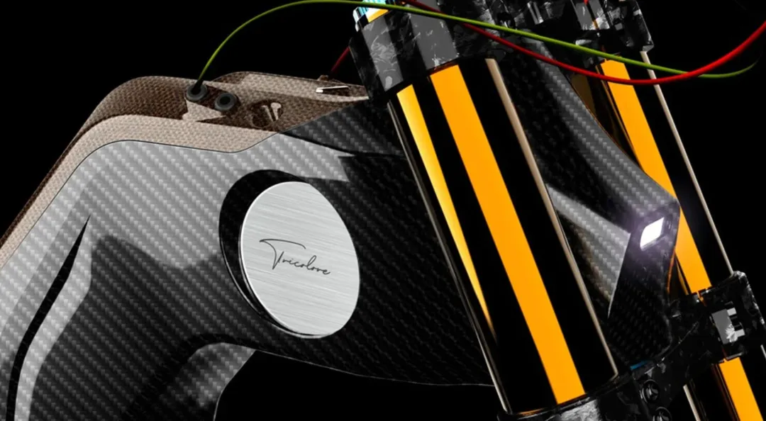 独特的后摇臂,据说是经过近两年的研究后才开发而成。看起来就是摩托车摇臂,完全由碳纤维制成,即轻巧又坚固。