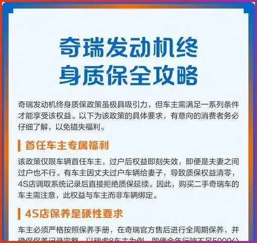 车圈混了这么多年.,我见过太多”三年六万公里”的质.保玩文字游戏,各种免责条款密密麻麻写了三页纸。奇瑞这次喊出终身质保,针对的.是首任车主、正常保养条件下.的三大件,条款相对清晰。对于预算有限.、又担心买国产车”用几年就趴窝”的消费者.来说,这个承诺的含金量,比任何一句广告语都实在。 你花4万买台车,厂家敢给.你终身兜底,这本身就是一种.底气。