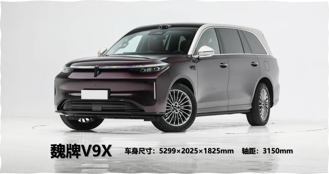 魏牌V9X是长城归元S平台首款车型,定位AI豪华六座旗舰SUV。采用2+2+2六座布局,搭载2.0T插混系统,发动机最大功率175kW,满电零百加速4.4秒,馈电状态4.7秒。基于800V高压架构,配备6C超充电池,纯电续航最高363km,支持5分钟补能200km。配备双腔空悬、后轮转向及激光雷达等等,总之尽一切的高端智能。