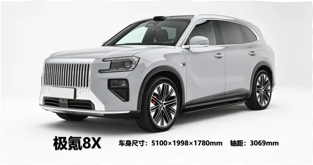 极氪8X车身尺寸5100×1998×1780mm,轴距3069mm,提供5座和6座版本。搭载2.0T插混系统,基于SEA-S超级电混架构,配备三电机四驱,综合功率400kW,峰值扭矩700N·m,零百加速4.9秒。提供70kWh和55kWh两种电池,CLTC纯电续航超400km,综合续航超1200km。首发新一代G-ASD高阶辅助驾驶系统,入门版预计售价43万元左右 。