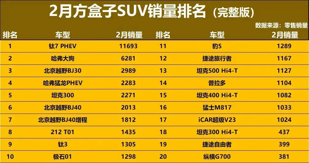方盒子SUV2月销量深析:钛7一骑绝尘,坦克300稳坐前五!