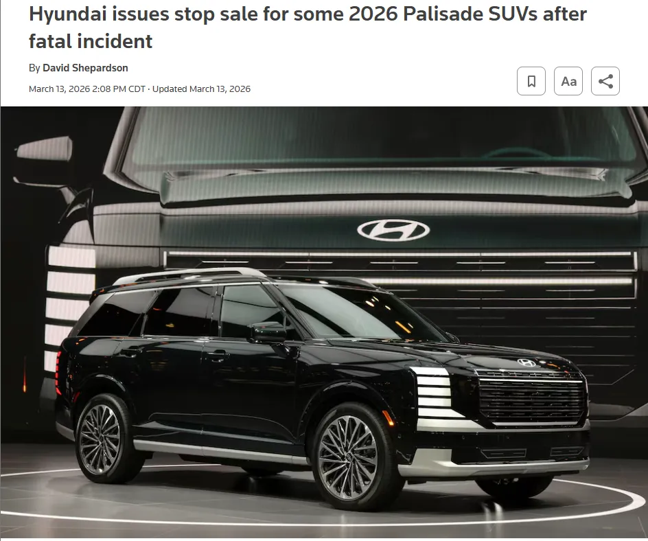 文章来源:https://www.reuters.com/business/autos-transportation/hyundai-issues-stop-sale-some-2026-palisade-suvs-after-fatal-incident-2026-03-13/