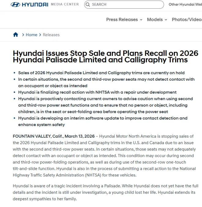 这家汽车制造商表示,由于第二排和第三排电动座椅可能无法按预期检测到与乘客或物体的接触,因此已暂停销售其2026款现代帕里斯帝Limited和Calligraphy车型。该公司没有透露3月7日事件的更多细节。