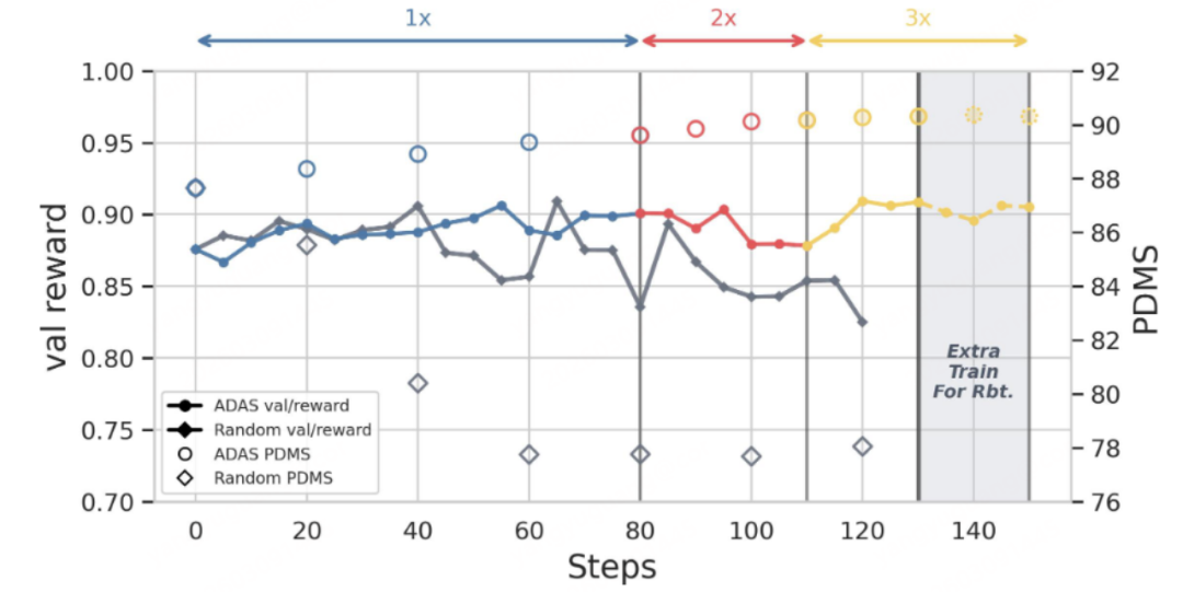 VLA应用本文提出强化学习方法ADAS(ADAS val/reward)与直接应用GRPO(Random val/reward)强化学习的效果对比图(来源:论文 补充材料Figure 6)