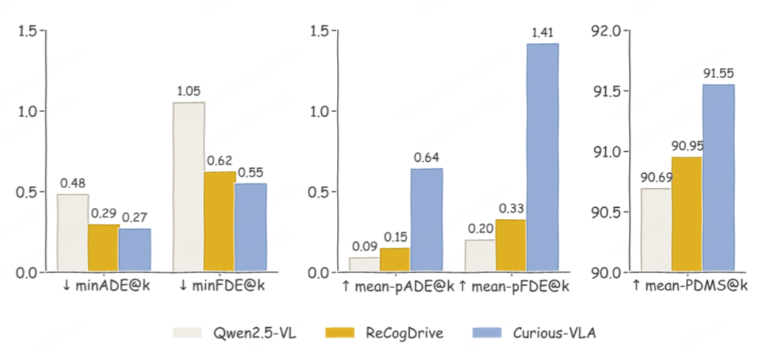除了整体性能指标之外,论文还重点分析了策略探索能力的变化。通过前文提出的Behavioral Diagnostics 指标可以看到,在引入 Curious-VLA 后,模型在 轨迹多样性(Diversity)和轨迹质量(Quality)两个维度上都取得了明显提升。