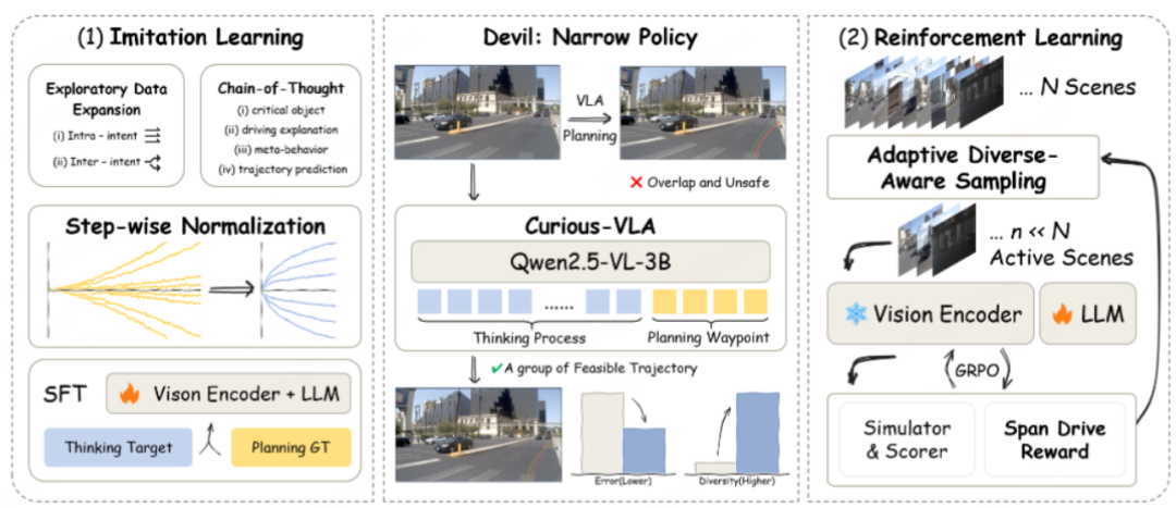 整个方法可以概括为一句话:在模仿学习阶段增加轨迹多样性,在强化学习阶段鼓励策略探索。具体来说,Curious-VLA包含两个关键部分。