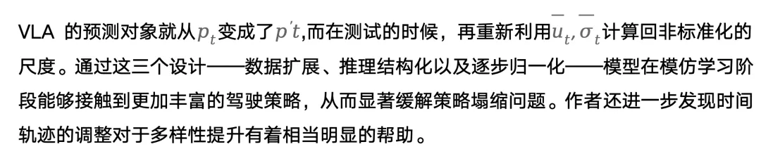 不过,当训练数据中包含大量不同轨迹时,又会出现一个新的问题:不同时间步的轨迹尺度差异非常大。远距离预测点的坐标变化远大于近距离预测点,导致训练时的梯度主要来自远端轨迹。为了解决这一问题,论文提出了Step-wise Normalization(SN)。该方法对每个时间步的轨迹坐标分别进行标准化处理,使不同时间步的误差处于相似的数值尺度,从而避免远端轨迹主导训练过程。具体来说,作者首先统计了NAVISM数据集中的每一条轨迹在1-T每一个时间步上动作的平均值和方差,接下来对训练VLA所使用的每一条轨迹的每一个时间步的动作执行如下标准化操作,如果第t步的轨迹动作为, 那么标准化后则表示为: