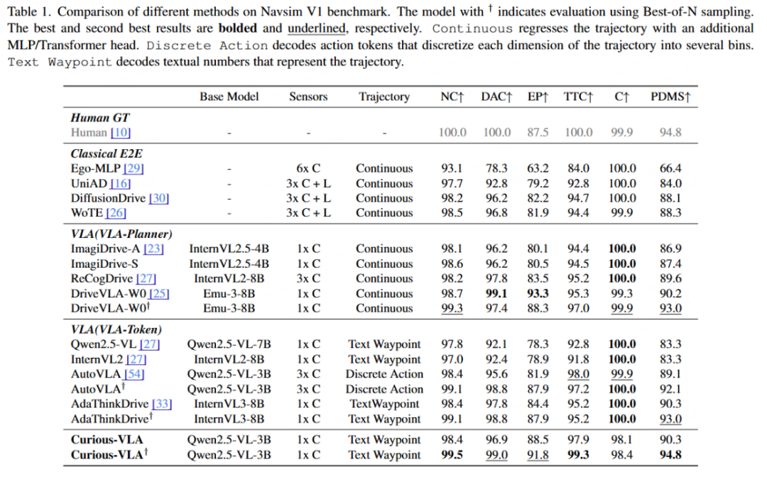 更值得注意的是,在Best-of-N 评估设置下(即从多个候选轨迹中选择最优轨迹),Curious-VLA 的 PDMS 达到了 94.8,几乎与Human Ground Truth 的 94.8持平。