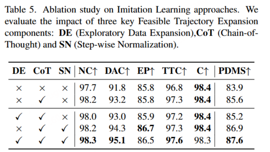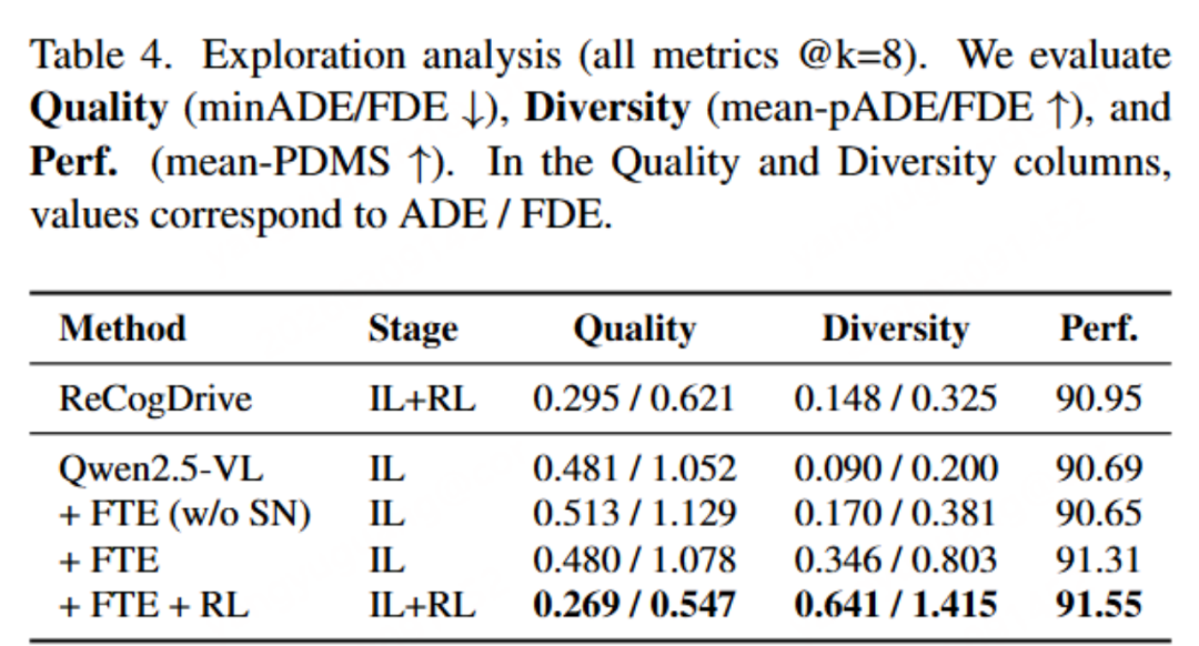 这些实验结果共同表明:策略探索能力确实是自动驾驶VLA性能提升的关键因素。当模型能够生成更加多样化的候选驾驶策略时,强化学习才能真正发挥作用,从而不断优化驾驶决策质量。