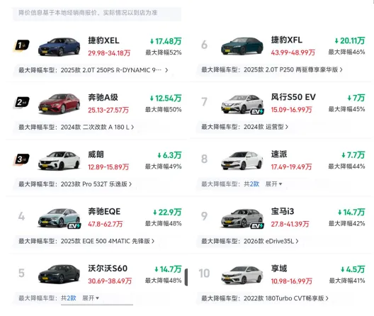 “冠军”有多夸张? 捷豹XEL以约52%的最高降幅站上榜首;奔驰A级紧随其后,价格直接进入“腰斩”叙事。与此同时,威朗冲进前三,沃尔沃S60、风行S50 EV等车型也出现45%+的下探;速派、宝马i3、享域同样稳居前10,终端让利相当扎眼。