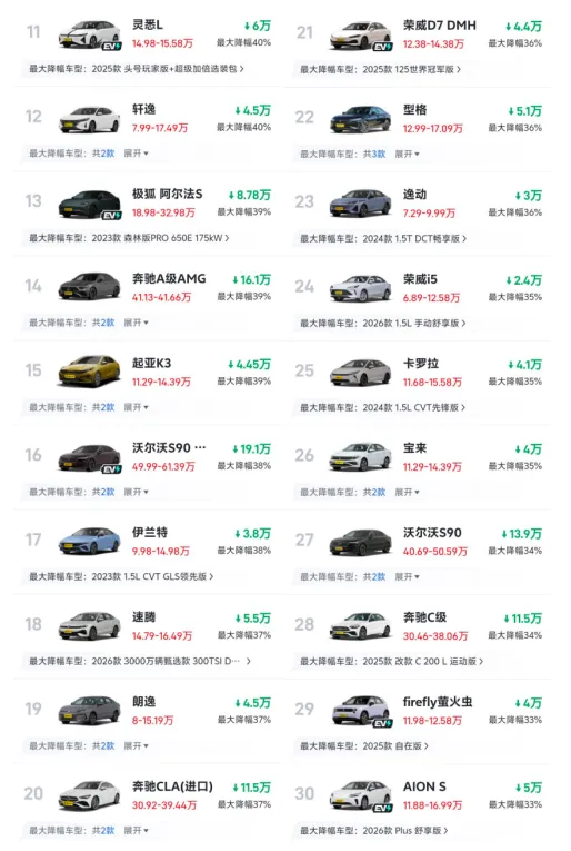 - 紧凑级主力混战:起亚K3、伊兰特、速腾、朗逸等最大降幅可到37%+。