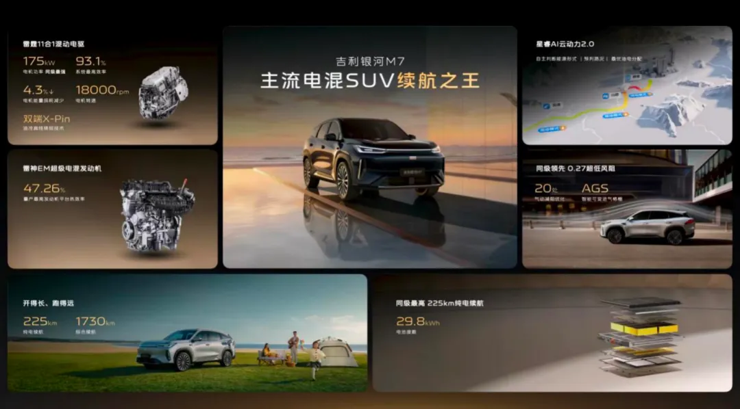 吉利一下干到225,直接把这个级别的天花板往上抬了七八十公里。说人话就是,如果你每天上下班来回30公里,以前那点纯电续航,周三就得开始烧油。现在好了,周一到周五纯电跑完,周六还能带孩子去趟动物园,全程不用一滴油。