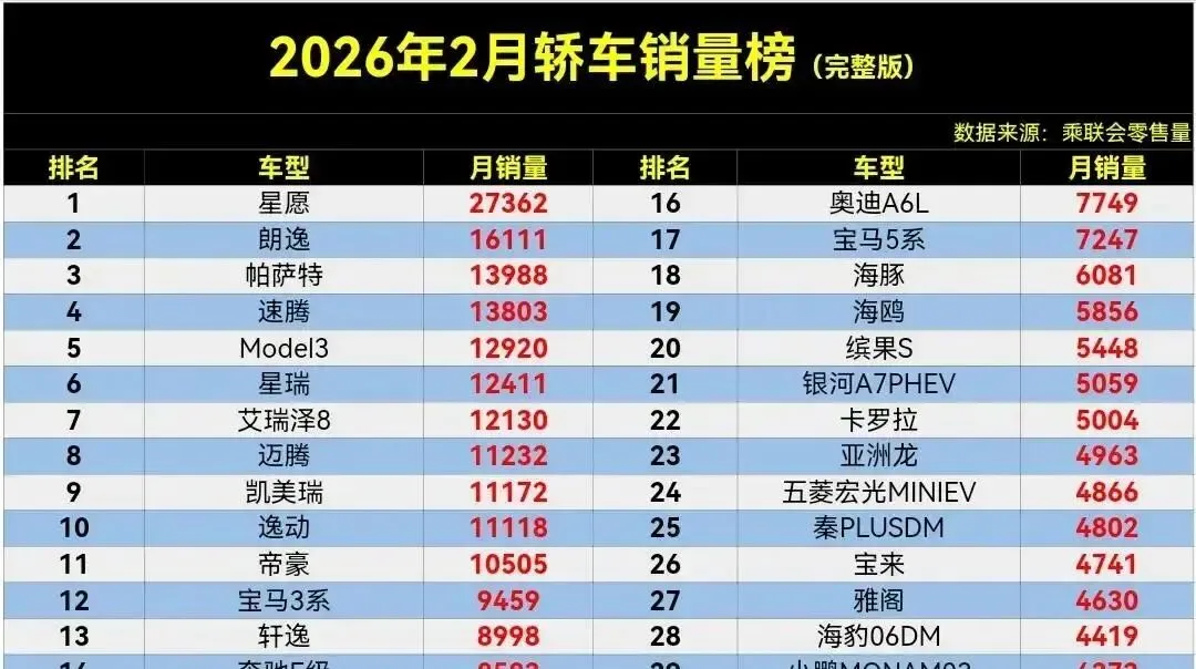 数据不会骗人。2026年2月,轿车市场真相就俩字:**务实**。年轻人要的是好用不贵,不是炫酷概念。星愿能夺冠,靠的是低价+实用;朗逸逆袭,全是家庭用户在托底。新能源?别急,市场还没完全转过来。但下个月呢?特斯拉如果真干到1.2万辆,说不定又是一波反转。