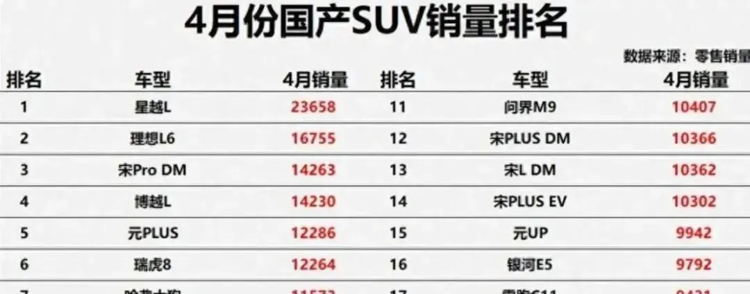 4月国产SUV榜2万辆星越L单月10万辆四个月累计6万辆CS75 PLUS累计15万元星越L起步价1200公里理想L6续航