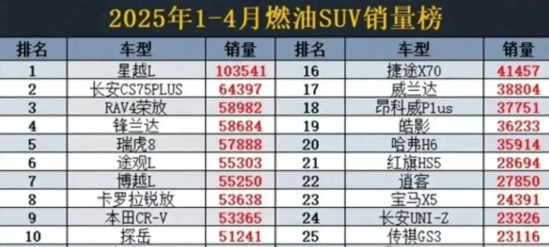 国产SUV销量榜单一图看个大概。时间拉长到2025年1-4月的累计销量,国产SUV对合资的压制就更清楚了。星越L四个月总销量突破10万辆,稳坐冠军;长安CS75 PLUS排在后面,累计也冲过6万辆;瑞虎8挤进前五。反观合资阵营,本田CR-V只排在第9名,丰田汉兰达甚至没能挤进前三十,“闭着眼买合资就稳”的时代正在远去。
