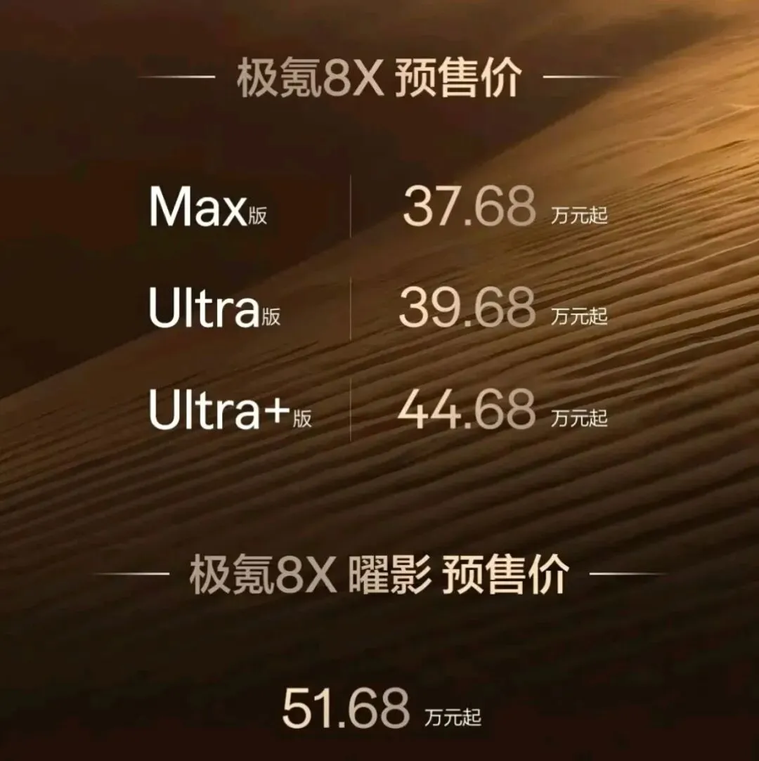 3月16日,极氪品牌全新高性能大五座旗舰电混SUV——极氪8X正式开启预售,共推出Max、Ultra、Ultra+及曜影四个版本,预售价格区间为37.68万元至51.68万元,计划于今年第二季度正式上市交付,全国门店已同步开放实车体验。该车基于全域自研的浩瀚-S超级电混架构打造,聚焦性能、智能、安全与舒适的全维度均衡。