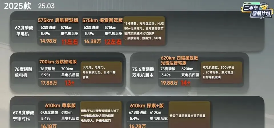 25款版本方面,62度电池两个版本,最低配拉低售价,然后往上升级大电池,最后顶配升级双电机四驱、800V平台,还标配了激光雷达。