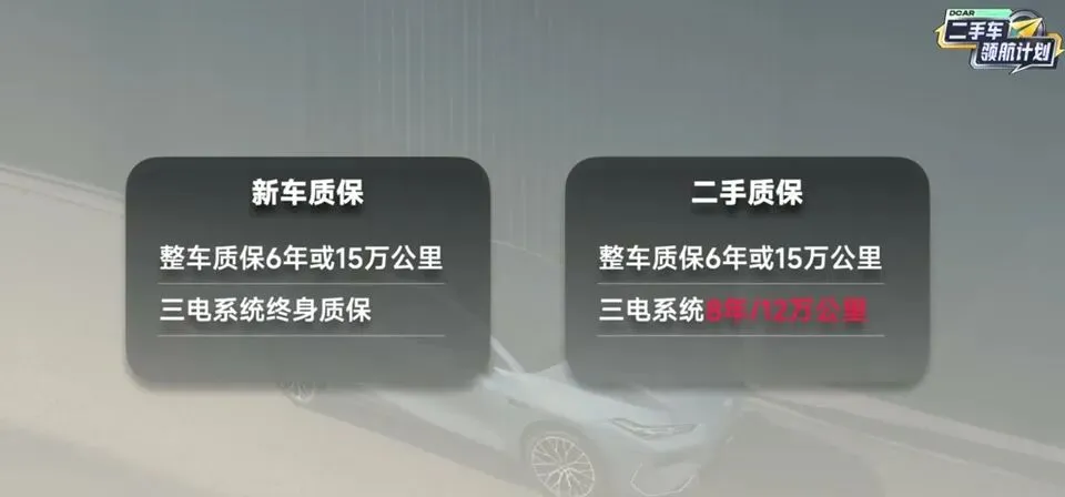 银河E8整车质保6年或15万公里,三电系统终身质保。到了二手,整车质保不变,三电系统变成8年或12万公里。我觉得影响不大,整车质保还有很多年,该够用的都够用。