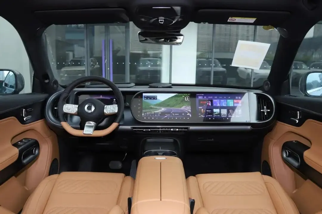拉开车门,smart精灵#5的内饰扑面而来的是一种融合了可爱与圆润的基调。线条少有棱角,中控台、门板扶手处能看到不少椭圆形的设计元素,这似乎延续了品牌一贯的灵动风格。车内能触及的区域,大面积使用了皮革材料进行包裹,触感比较细腻。视线前方,一块横贯驾驶席与副驾前方的联体屏幕成为视觉焦点,它由两块13英寸的OLED屏无缝拼接而成,分辨率为2.5K,显示画质清晰,色彩饱和度也表现得不错。