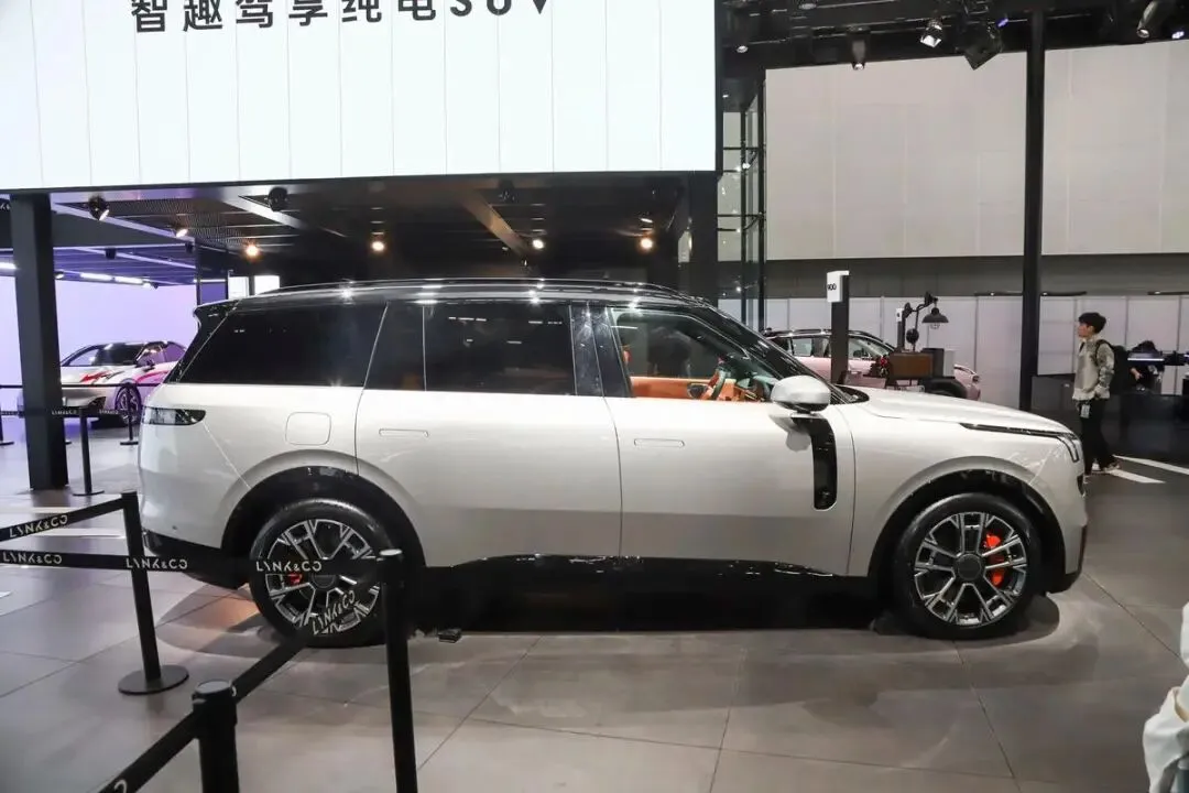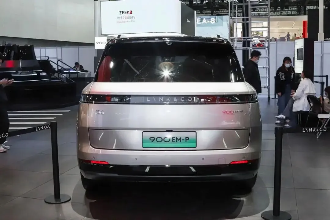 领克900的外形,前脸延续了领克家族的分体式大灯设计,上方是细长的日行灯带,下方是远近光灯组,中间还有贯穿式的灯带连接,整体看起来比较协调,辨识度也还不错。车身侧面线条处理得比较简洁,没有太多复杂的腰线,而是通过型面变化来营造光影效果。隐藏式门把手、悬浮式车顶这些流行元素都有出现,配合大尺寸轮圈,侧面姿态显得比较舒展。车尾采用贯穿式尾灯,灯组内部细节比较丰富,点亮后的视觉效果比较精致,整体风格偏向沉稳和科技感。
