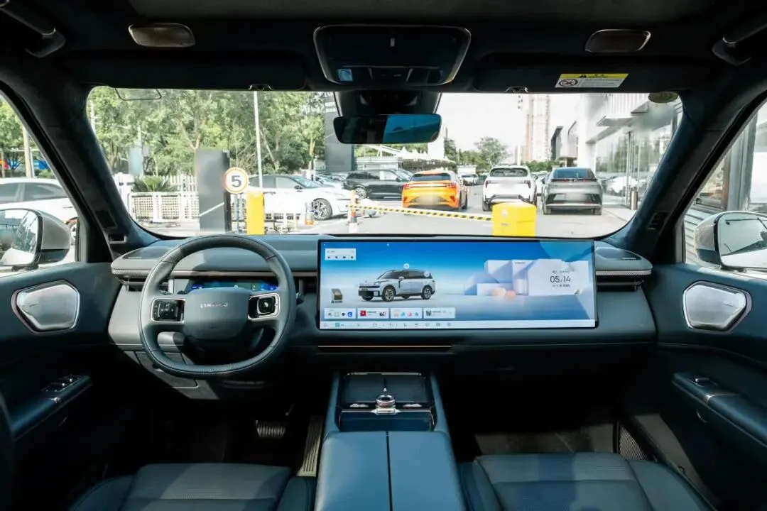 打开车门,领克900的车内给人的初印象是开阔且规整。五米二的车身与近三米二的轴距,让设计师有足够空间施展。仪表台采用简洁的水平线条,弱化了传统T型区的厚重感。目光所及之处,软性材质和皮革包覆覆盖了主要区域,细节处的缝线工艺比较细腻。前排最引人注目的莫过于横贯于仪表台的那块大尺寸屏幕,尺寸达到30英寸,分辨率有6K,清晰度和色彩的饱和度都较为出色,车机系统响应迅速,这背后是高通骁龙8295芯片提供算力支撑。系统内置的Flyme Auto界面逻辑清晰,同时支持CarPlay、HiCar等多品牌手机互联,为不同用户提供了便利。方向盘采用真皮包裹,握感饱满,集成的多功能按键阻尼清晰。换挡机构采用了怀挡设计,为中央通道区域腾出了更多储物空间。