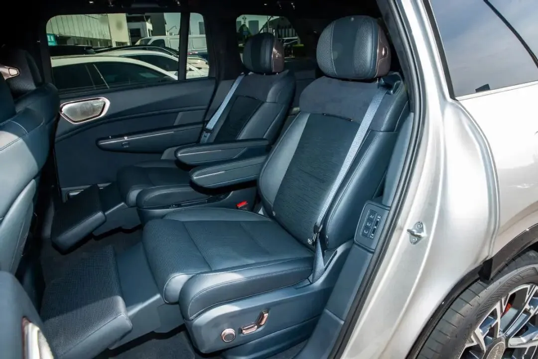 落座其中,前排的空间感相当充裕。对于一名身高175厘米的乘客来说,调整好驾驶坐姿后,头部到天窗下沿的距离超过一拳,横向宽度由于车身接近两米,肩部活动相当自如。座椅由Nappa真皮包覆,皮质触感柔和。主副驾座椅均支持多向电动调节,并配备了加热、通风和按摩功能,填充物软硬适中,侧向支撑比较到位,长时间乘坐的承托感不错。来到第二排,得益于独立座椅设计,乘客可以独立调节靠背角度和腿托,获得一个相对舒展的坐姿。此时膝部空间非常宽裕,头部空间也并无压抑感。第三排座椅并非摆设,在第二排座椅适度前移后,175厘米的乘客也能获得可以接受的腿部空间,用于中短途出行是可行的。