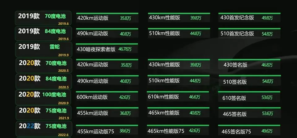 - 2020款:最多最杂,分两批共12个版本。后期带来了100度电池包和75度电池包,升级了骁龙820芯片和数字座舱