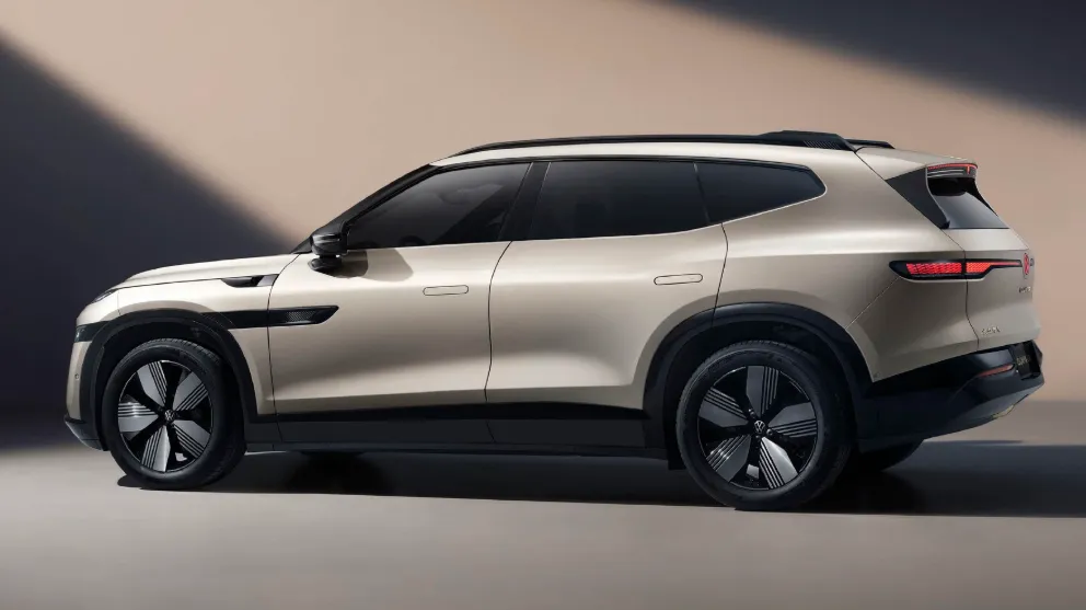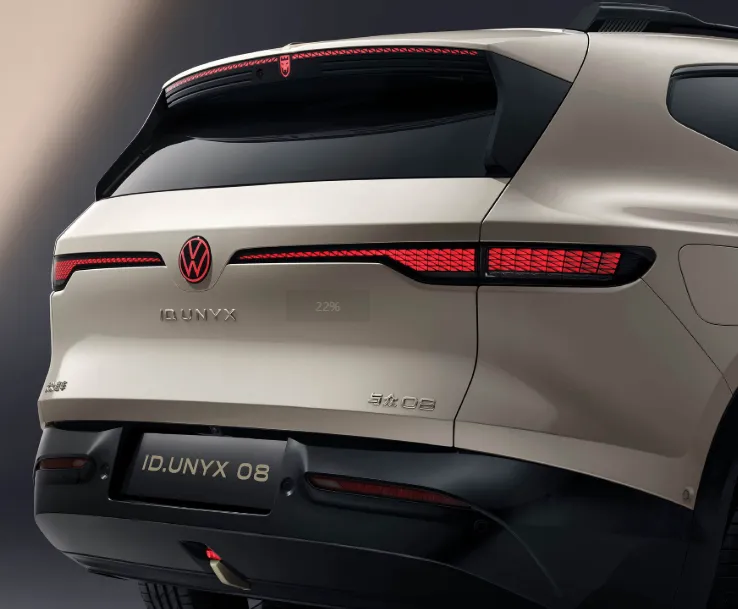 从侧面来看,这款大众与众08匹配了金色的轮毂,也采用了隐藏式电动门把手设计。尾部则是数码样式的尾灯,以及数码造型的贯穿式刹车灯,尾部Logo同样也是可以点亮的。这款大众与众08的定位是一款中大型SUV,车长达到了5米,而轴距更是长达3030mm。