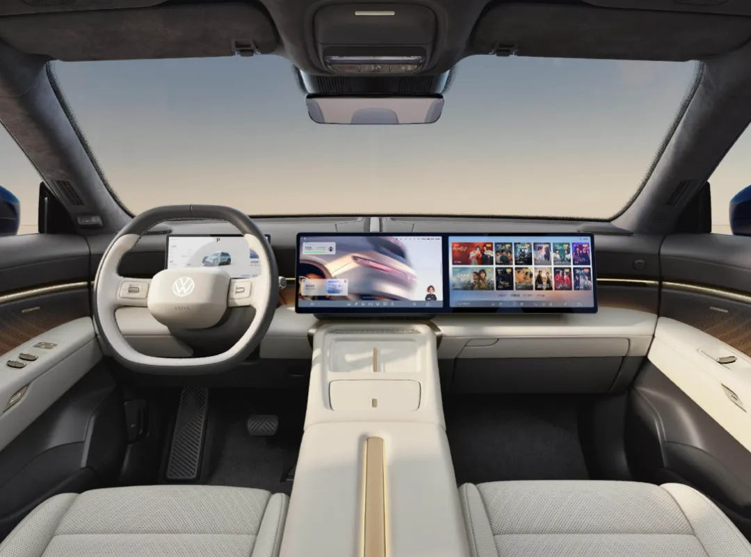 内部构造同样具备了不错的水准。车内采用了大量的金色装饰线条,看起来还是挺有档次的。此外,还采用了双14.96英寸的连屏设计,并且应用丰富。值得一提的是,这款大众与众08还有着诸多舒适性的设计,比如副驾驶位是带有零重力座椅的。而全景大天窗更是达到了1.74平方米,具备智能调节光幕的配置。
