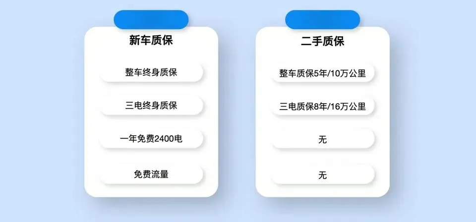 新车有整车终身质保、三电终身质保,还有一年2400度免费充电。但到了二手,这些权益都没了——整车质保变成5年或10万公里,三电系统8年或16万公里。担心空悬寿命的可能需要注意一下。